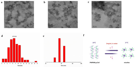 (a–c) The TEM images of PNIPAM-g-Cell micelles in water; (d,e) the particle size distribution of PNIPAM-g-Cell micelles in water obtained through TEM (d) and DLS (e); (f) schematic diagram of self-assembly of PNIPAM-g-Cell micelles at 37 °C.