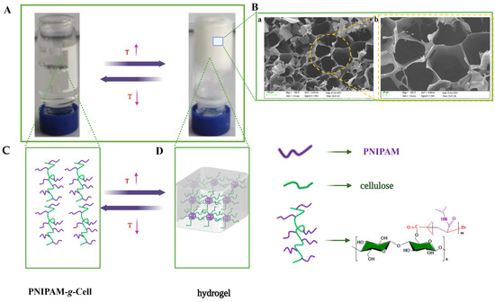 (A–D) The sol–gel properties (A), SEM image (B), and the formation mechanism of (C,D) of the cellulose-based injectable hydrogel obtained from PNIPAM-g-Cell.