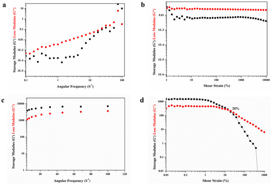 (a–d) Frequency sweep (a) and oscillatory stress sweep analysis (b) of the PNIPAM-g-Cell at 4 °C. Frequency sweep (c) and oscillatory stress sweep analysis (d) of the PNIPAM-g-Cell hydrogel at 37 °C.