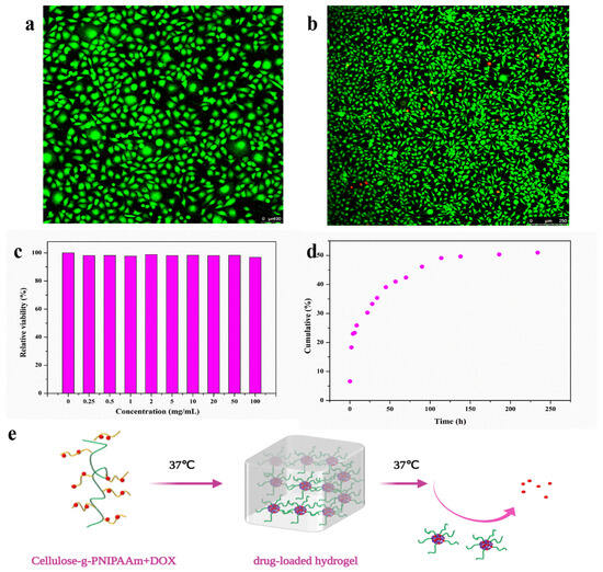 (a) Fluorescence image of L929 cells with 100 mg/mL PNIPAM-g-Cell injectable hydrogel extract; (b) fluorescence images of L929 cells with 5 mg/mL cellulose–g-PNIPAAm injectable hydrogel extract; (c) viability histograms of L929 cells after co-cultivation with different concentrations of PNIPAM-g-Cell injectable hydrogel leaching liquor; (d) release curves of DOX in the PNIPAM-g-Cell injectable cellulose hydrogel at 37 °C; (e) schematic diagram of loading and release mechanism of the PNIPAM-g-Cell injectable cellulose hydrogel.