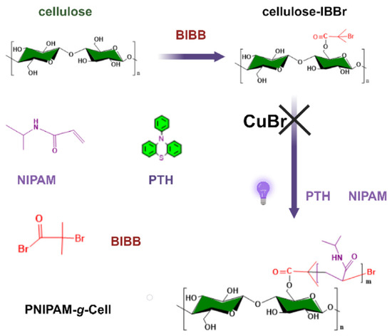 In this study, we attempted to incorporate the BIBB group onto cellulose to create a cellulose macroinitiator for use in organocatalyzed ATRP. The organocatalyzed ATRP reaction was then carried out using the BIBB-functionalized cellulose as the initiator and PTH as the catalyst. The specific mechanism is illustrated in Figure 1. Under UV irradiation, PTH is excited to form a potent reducing agent, PTH*, which generates the oxidation radical cation, PTH*+. Subsequently, the initiator (with polymer Pn) is activated to produce free radicals that react with the NIPAM monomer to form an alkyl radical, which is deactivated by PTH*+ regenerating the ground state of PTH [17].