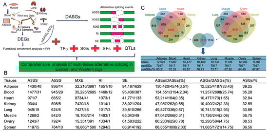 Studying AS in pigs will deepen our understanding of pig gene functionality and regulatory mechanisms and shed light on their relationships and evolutionary processes with other species. Moreover, as society progresses and concerns about food safety and environmental protection grow, pigs have garnered increased attention as a major livestock animal [19]. Investigating AS characteristics in Eastern and Western pigs can offer valuable insights into pig domestication and breeding, leading to improvements in productivity and adaptability and contributing to the sustainable development of the pork industry. Researchers have identified widespread pre-RNA AS occurrences in multiple pig tissues [20,21,22]. However, the differences in AS among various tissues of Eastern and Western pigs and their molecular regulatory mechanisms remain unclear.