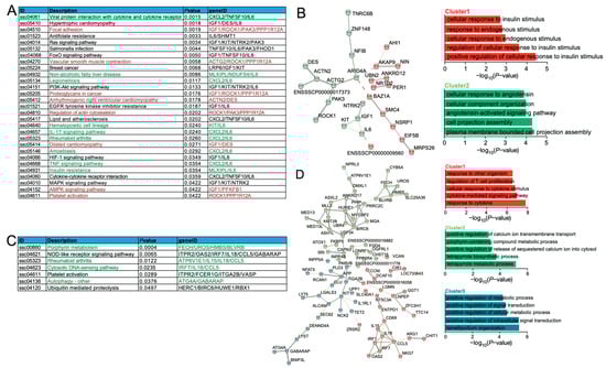 Functional enrichment analysis of the coDASG_DEGs. (A) Significant KEGG pathway of coDASG_DEGs in adipose (p < 0.05). (B) PPI analysis of coDASG_DEGs in adipose tissue. (C) Significant KEGG pathway of coDASG_DEGs in blood (p < 0.05). (D) PPI analysis of coDASG_DEGs in blood. The left panel represents the PPI predicted with the coDASG_DEGs. These genes are divided and colored into different clusters according to K-means. The right panel shows the biological process terms predicted with the genes in different clusters. The color of the cluster on the right panel is the same as the color of the gene on the left panel.