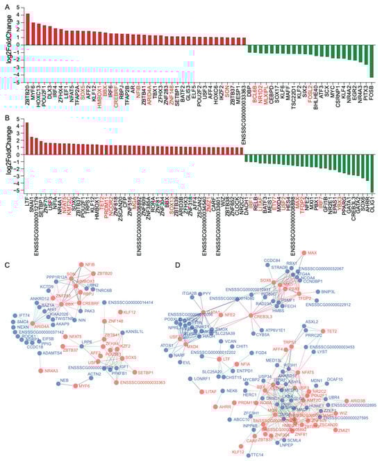 Combined analysis of the coDASG_DEGs and TFs. (A,B) TFs in DEGs of adipose (A) and blood (B). The red and green bars denote the up-regulation and down-regulation of TF in the Eastern pig, respectively. The red font indicates that the differentially expressed TF also undergoes differentially alternative splicing. (C,D) The interaction network of TF and the coDASG_DEGs in adipose (C) and blood (D). TFs and coDASG_DEGs with a correlation coefficient (r) greater than 0.9 and a p value less than 3.40 × 10−14 were screened and made into an interaction network. The red and blue dots separately represent TF and genes.