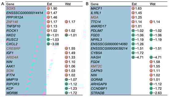 Genes under selection (SGs) in coDASG_DEGs of adipose and blood tissues. (A,B) The overlapped genes of SGs and coDASG_DEGs in adipose (A) and blood (B). Est and Wst represent SGs in Eastern and Western pigs, respectively. Red dots with positive values and green dots with negative values indicate the genes are up-regulated and down-regulated in Eastern pigs, respectively. The genes in red font are TFs.