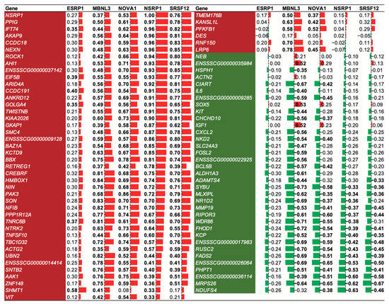 Furthermore, among the 83 coDASG_DEGs, we found that 74 (89.16%) genes exhibited consistent correlation patterns with these five SFs, with 44 genes showing positive correlations and 30 genes showing negative correlations. It suggested that these SFs may play a co-regulatory role in the process of AS (Figure 5). After sorting the 415 SF-coDASG_DEG pairs in descending order of correlation coefficient, we found that the top 18 pairs of genes were significantly and highly positively correlated with the splicing factor NSRP1 (r > 0.86, p < 6.10 × 10−12, Figure 5). These genes included PPIG, IFT74, AKAP9, CCDC18, NEXN, ROCK1, AHI1, ENSSSCG00000037142, EIF5B, ARID4A, CCDC191, ANKRD12, GOLGA4, TWISTNB, KIAA2026, GKAP1, SMC4, and ENSSSCG00000009128 (Figure 5), indicating that the SF NSRP1 may have significant regulatory effects on adipose AS and pig adipose deposition.