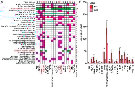 Comparison of NSRP1 and its related genes with QTLs related to adipose traits. (A) The information of QTLs and the related genes. The genes in the figure are splicing factor NSRP1 and the genes highly correlated with it (r > 0.86, p < 6.10 × 10−12). Green and rose-red squares represent genes present in the corresponding QTLs. The numbers on the top indicate the number of QTLs in which a specific gene is present, and the numbers on the right indicate the number of genes present in a specific QTL. Genes in red font represent more than 12 QTLs related to them. (B) Comparison of the expression level of these genes in Eastern and Western pigs. Est: Eastern, Wst: Western. ** represents the p-value is less than 0.01, *** means the p-value is less than 0.001.