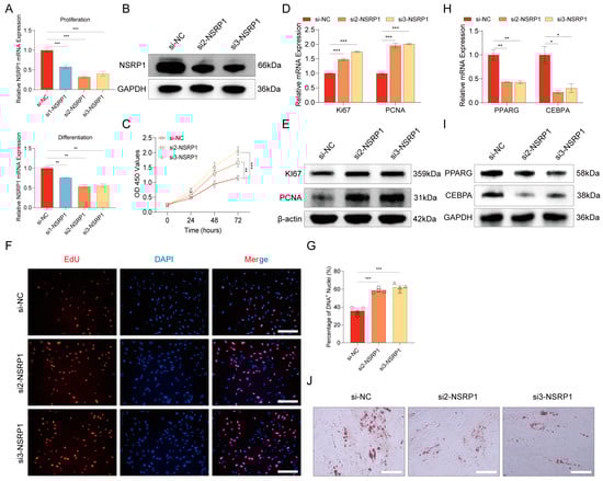 Proteins were extracted by RIPA buffer (Thermo Scientific, Waltham, MA, USA) supplemented with phosphorylase inhibitor (Roche 5892791001, Basel, Switzerland) and protease inhibitor (Roche 04693132001, Basel, Switzerland). The concentration of obtained protein was measured by the BCA kit (Beyotime, Shanghai, China). The proteins were separated in 10% sodium dodecyl sulfate-polyacrylamide gel electrophoresis (SDS-PAGE) gels (EpiZyme, Shanghai, China) and transferred onto 0.45 µm Hybridization Nitrocellulose Filter (NC) membrane (Merck, Rahway, NJ, USA), and then probed with antibodies following standard procedures. These membranes were blocked with 5% skim milk at room temperature for 2 h, and then incubated with primary antibodies at 4 °C overnight. Subsequently, the membranes were incubated with secondary antibodies at room temperature for 1 h. The following antibodies were used in the present work: NSRP1 (1:500, 21360-1-AP, Proteintech, Wuhan, China), GAPDH (1:50,000, 60004-1-Ig, Proteintech, Wuhan, China), β-actin (1:20,000, 66009-1-Ig, Proteintech, Wuhan, China), KI67 (ab16667; 1:1000; Abcam, Cambridge, UK), PCNA (1:5000, 10205-2-AP, Proteintech Group, Wuhan, China), PPARG (1:1000, 16643-1-AP, Proteintech Group, Wuhan, China), CEBPA (1:500, 18311-1-AP, Proteintech Group, Wuhan, China). Secondary antibodies: Goat Anti-Rabbit (ZB-2301, 1:1000, ZSGB-BIO, Beijing, China) and Goat Anti-Mouse (ZB-2305, 1:1000, ZSGB-BIO, Beijing, China).