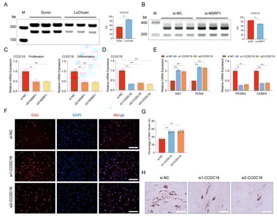 CCDC18 was a coDASG_DEG that was significantly highly expressed in Eastern pigs, which was found to be highly positively correlated with NSRP1 (r = 0.96, p < 1.00 × 10−16). An SE-type alternative splicing event occurred at exon 23 (100 nucleotides) of the CCDC18 gene. To validate differential alternative splicing events in CCDC18 identified through transcriptome data analysis between Eastern and Western pig breeds, we extracted adipose tissues from the representative Western breed, Duroc; and the Eastern breed, Luchuan pig. Semiquantitative RT-qPCR experiments were conducted, revealing significant differences in the alternative splicing events of CCDC18 between Eastern and Western pig breeds. Notably, the Percent Spliced In (PSI) values in Luchuan pig were markedly higher than those in Duroc (Figure 8A). Furthermore, we validated whether NSRP1, as the alternative splicing factor, could regulate the occurrence of alternative splicing in CCDC18. Semiquantitative results demonstrated a significant decrease in the PSI values of CCDC18 when NSRP1 was downregulated in pre-adipocytes (Figure 8B). This suggested that NSRP1 indeed has the capability to regulate the strength of alternative splicing events in CCDC18. Afterward, we further verified whether NSRP1 could regulate the expression of CCDC18. The RT-qPCR results revealed significant inhibition in the mRNA of CCDC18 during both cell proliferation and differentiation stages following si-NSRP1 treatment (Figure 8C). The above results indicate that NSRP1 serves as the alternative splicing regulatory factor, not only modulating the occurrence of alternative splicing in CCDC18 but also concurrently regulating the expression of CCDC18.