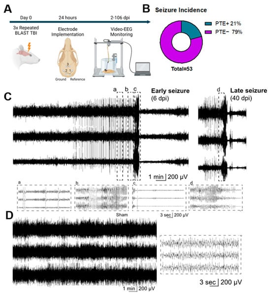 Stereotactic surgery was performed on all sham and rbTBI mice 24 h after blast, as previously described [69]. Briefly, mice were anesthetized with 3.5% isoflurane for 5 min before placement into the stereotactic apparatus (Kopf Instruments, Tujunga, CA, USA). Buprenorphine (0.1 mg/kg) was administered subcutaneously for analgesia. The isoflurane level was maintained at 1.5% during the surgery. Stainless steel electrodes (0.10″ screw with wire leads (#8403, Pinnacle Technology, Parsippany, NJ, USA) or 00-96 × 1/16 (1.6 mm) screws with wire leads (Plastics1)) were implanted epidurally for chronic intracranial recordings (Figure 1A). Wire leads from the electrodes were connected into the custom 6-pin connector for 2 monopolar and 1 bipolar EEG channels (#8235-SM-C, Pinnacle Technology) or 6 channel electrode pedestals for 3 monopolar EEG channels (#MS363, Plastics One, Roanoke, VA, USA). For EEG acquisition, we used two systems: Pinnacle Technology (8200-K1-SE system) and Biopac Systems (Goleta, CA, USA) (ERS100C amplifiers, MP160 system) at the 2000 Hz sampling rate with a high-pass cutoff at 1 Hz (Pinnacle Technology and Biopac Systems), and a low-pass cutoff at 1000 Hz (Pinnacle Technology) and 3000 Hz (Biopac Systems). For synchronized 24/7 video data acquisition, cameras had either integrated or separate infrared sources for dark hours video acquisition and were affixed over (dome cameras) or in front of (box cameras) the single-housed Plexiglas cylinders. Video-EEG data were collected continuously (24/7) with programmed, automated restart every 24 h for four months. EEG acquisition was acquired using Sirenia Acquisition v2.2.11 (Pinnacle Technology) and Acqknowledge 5 (Biopac Systems) software.