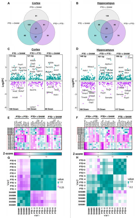 Figure 2. Identification of DEPs’ rbTBI-associated PTE and PTE+ cortex and hippocampus. (A,B) Venn diagrams showing unique and shared DEPs between each comparison in the cortex (left) and the hippocampus (right). (C,D) Volcano plots of all DEPs in each comparison from either the whole cortex (left) or the whole hippocampus (right) with an adjusted p-value ≤ 0.1 and an FC greater than l 1.2 l, with the top ten dysregulated proteins marked. (E,F) Heatmap of the top 10 dysregulated DEPs in each comparison in either the whole cortex (left) or the whole hippocampus (right) based on z-score. Dotted box in E marks injury related effects, while the dotted box in F marks a seizure related effect. (G,H) Correlation heatmaps from either whole cortex (left) or whole hippocampus (right) samples based on the top 10 upregulated and top 10 downregulated DEPs’ intensity value in each comparison (PTE vs. sham, PTE+ vs. sham, and PTE+ vs. PTE, for a total of 60 proteins per brain region).