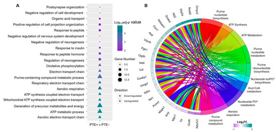 Figure 3. Functional enrichment analysis identifies disrupted biological processes related to the mitochondrial functional rbTBI-associated hippocampus. (A) Top 10 downregulated (circles) and top 10 upregulated (triangles) GO biological process pathways identified in the whole hippocampus PTE+ vs. PTE comparison. (B) GO chord plot indicating shorthand descriptions of biological processes relating to mitochondrial dysfunction and oxidative phosphorylation dysregulated in the whole hippocampus PTE+ vs. PTE comparison and the corresponding DEPs present in the gene list per term with associated log2FC.