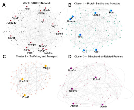 Figure 4. STRING analysis identifies three distinct sub-networks through k-means clustering. (A) Whole network of DEPs from the hippocampal PTE+ vs. PTE comparison. Nodes with the highest centrality through analysis or unbiased PageRank system are colored as red. (B) Sub-network denoting proteins related to protein binding and structural proteins, with high centrality or PageRank nodes marked in blue. (C). Sub-network denoting proteins related to trafficking and transport, with high centrality or PageRank nodes marked in orange. (D). Sub-network denoting mitochondrial proteins, with high centrality or PageRank nodes marked in purple.