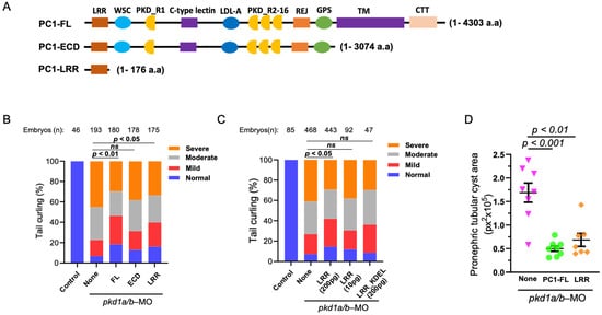 Wild-type zebrafish (Danio rerio) were bred and maintained at 28 °C in a 14–10 h light–dark cycle. All procedures were followed in accordance with the approved protocols by the University of Iowa Animal care and Use committee. Experiments were performed as previously described [38]. Briefly, knockdown of zebrafish pkd1a and pkd1b genes was carried out by injecting previously validated gene-specific antisense MO oligonucleotides (Gene Tools, LLC, Philomath, OR, USA) [15]. At 1–4 cell stage, each fertilized egg was microinjected with 2 ng of either pkd1a or pkd1b MO or both. In addition to MOs, embryos were injected with 200 pg of in vitro synthesized capped mRNAs or vehicle in a total volume of 4.6 nL by using a Nanoject microinjector (Drummond Scientific, Broomall, PA, USA). Injected embryos were incubated in egg water at 28 °C and analyzed at 3 days post-fertilization (dpf). For histological sectioning and staining, embryos at 3 dpf were fixed in 4% paraformaldehyde at 4 °C overnight. Afterwards, embryos were sequentially treated with 10% and 20% sucrose for 30 min each and then with 30% sucrose until they sink to the bottom of the tube. Then, the embryos were fixed in a mold and embedded in optimal cutting temperature (OCT) medium and sectioned at 5 μm. Following Sullivan-Brown et al., tissue sections were stained in Hematoxylin and Eosin stain and imaged on a Nikon Eclipse E600 [39]. Afterwards, pronephric tubular cyst areas as marked by asterisks in the lower panel of Supplementary Figures S1 and S2 are measured from the procured images and presented as pixel square.