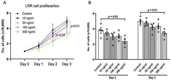 So far, transgenic expression of the LRR domain in ZF embryos supports its anti-cystogenic effect by suppressing dorsal-tail curvature and pronephric cyst area. A previous study reported that LRRs play a suppressive role in cell proliferation [17]. We used HEK293 cells as an in vitro model to validate the effect of LRRs. Purified LRR domain was added to the culture media of proliferating HEK293 cells at different concentrations ranging from 10 ng/mL to 300 ng/mL (Figure 3A,B). At low dosage (10, 30, and 100 ng/mL), LRRs tended to decrease the cell proliferation rate compared to no LRRs, but the effects were not statistically significant. However, cell proliferation was significantly inhibited at 300 ng/mL LRR on Day 2 and 3. Thus, LRRs cause a dose-dependent inhibition of cell proliferation of HEK cells in culture.