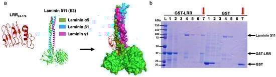 An LRR binds to an extracellular matrix protein laminin-511. (a) In silico analysis suggests a molecular interaction between the LRR domain and E8 fragment of heterotrimeric laminin-511 composed of laminin α5, laminin β1, and laminin γ1 chains. (b) Co-purification of laminin-511 along with GST-LRR suggests a physical interaction. GST-tag alone was used as negative control. M = protein marker, 1 = loading sample, 2 = flow through, 3 = wash, 4 = Lamin511 loading sample, 5 = flow through, 6 = washing of laminin after 1 h incubation, 7 (red arrows) = co-elution of GST-LRR or GST (or GST-LRR mutant E107A or W139C in Figure 5B) with laminin. Representative data shown are from 3 independent experiments.