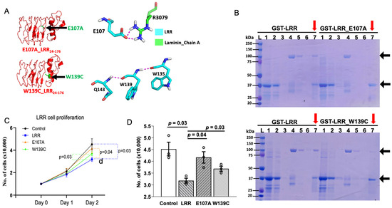 LRRs mediate the anti-proliferative effect by regulating PC1–laminin interaction. (A) (Upper panel) Structural analysis predicts that glutamate residue at E107 of LRR domain interacts with arginine residue at 3079 of α5 chain in laminin-511. Similarly, LRR residue tryptophan at 139 (lower panel), an ADPKD pathogenic variant, was found to be in a crucial α-helix conformation with Q143 and W135, alteration of which may hinder LRR–laminin interaction. (B) Unlike LRRs, laminin-511 was not copurified along with E107A and W139C mutants. M = protein marker, 1 = loading sample, 2 = flow through, 3 = wash, 4 = loading of Lamin511_Trimer, 5 = flow through, 6 = washing of laminin after 1 h incubation, 7 (red arrows) = co-elution of GST-LRR/GST/E107A/W139C and laminin. Representative data shown are from 3 independent experiments. (C,D) show cell proliferation is significantly inhibited by addition of LRRs (300 ng/mL) on Day 2 but not by E107A and W139C mutants. Data shown are from at least 3 independent experiments. Data are presented as mean ± SEM.