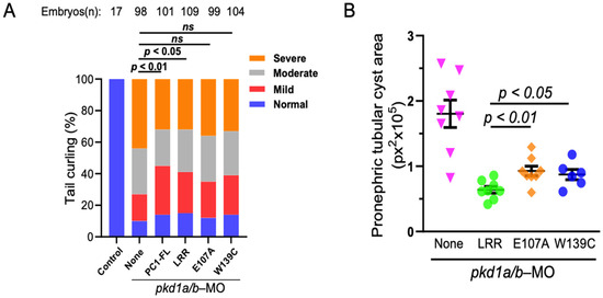 LRR–laminin interaction is necessary for anti-cystogenic effect of LRRs. (A) shows that transgenic expression of PKD1 or LRRs rescues tail curvature phenotype in pkd1-morphant ZF embryos, while both E107A and W139C-LRR mutants do not. Data presented are from at least 3 independent experiments. The total number (n) of embryos from combined multiple experiments is shown on top. Statistical analysis was performed by χ2 test. (B) Pronephric tubular cyst areas are quantitated in vehicle (None), LRR-, E107A-, or W139C-expressed ZF embryos co-injected with pkd1a/b morpholinos. Total cystic area is significantly reduced in LRR-expressed pkd1-MO ZF embryos but not with E107A and W139C. Cystic area is presented as pixels squared (px2). Data are presented as mean ± SEM. ns = not significant.