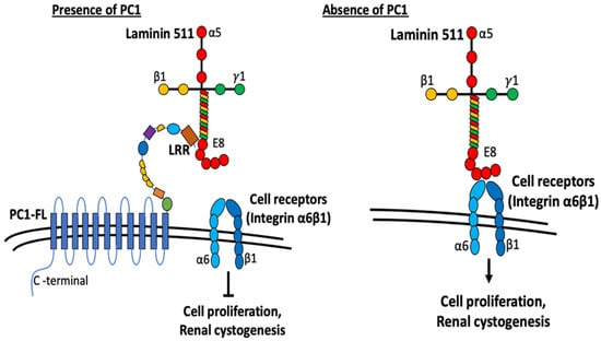 Working model depicting the role of LRRs in modulating cell proliferation and cystogenesis. Current work suggests the role of PC1 as a modulator of ECM components. N-terminal extracellular fragment of PC1 contains multiple domains similar to various adhesion proteins that are involved in cell–cell and cell–matrix contacts. LRR domains in PC1 interact with laminin-511 and inhibit its interaction with cell-surface receptors integrin α6ß1. Without PC1, laminin-511 interacts with integrin α6ß1 to trigger downstream signaling cascades promoting cell proliferation and renal cystogenesis. See text for more details.
