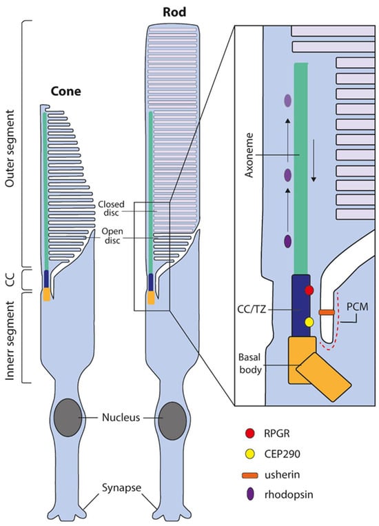 The retina is the tissue responsible for visual perception and is composed of multiple distinct cell types. Photoreceptors are the primary light-sensing neurons within the retina, responsible for photon capture and the initiation of the phototransduction cascade, which converts light stimuli into electrical-chemical signalling to be transmitted to the brain for interpretation. Both cone and rod photoreceptors are highly specialised cells containing stacks of membranous discs with photosensitive opsin pigments. These discs are located within a compartment known as the outer segment; in rods, each disc is surrounded by a separate plasma membrane and, in cones, all of the disc membranes are continuous with the outer segment plasma membranes (Figure 1). The outer segment lacks the capacity for protein synthesis and relies on the transport of proteins from the inner segment through the connecting cilium, a specialised microtubular structure essential for the maintenance and regulation of the outer segment (Figure 1) [1,2]. Impairment of the cilium leads to photoreceptor dysfunction and eventual cell death, which can be observed in the group of inherited retinal dystrophies that affect aspects of the cilium in the photoreceptors, broadly known as retinal ciliopathies [3,4].