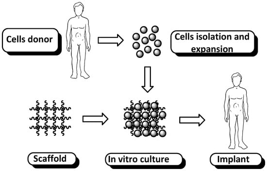 Tissue engineering (TE) is a modern research field that deals with the replacement, repair, or regrowth of damaged or malfunctioning tissues and organs [,,,,,,]. The first works on the topic appeared in the seventies, but the birth of the term tissue engineering can be traced back to 1988 at a workshop held in February in Granlibakken, Lake Tahoe (CA, USA) []. Later (1993), the work in which TE was defined as “an interdisciplinary field in which the principles of engineering and life sciences are applied” was published []. The crucial phases of TE consist of extracting cells from the tissue of the donor patient, cultivating the extracted cells in vitro, making them proliferate on a support structure (scaffold), and implanting the new tissue in the donor patient via surgery or injection (Figure 1). Ideally, the scaffold should resist after implantation for the time necessary for the growth of the new tissue and then be replaced by it.
