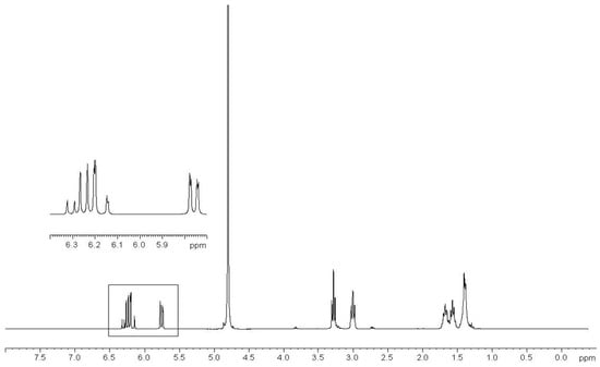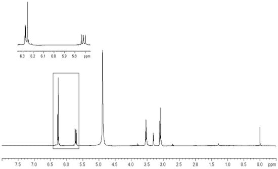 Since the 1H NMR spectra of all monomers 11a–c were acquired in CD3OD, H2O, or a mixture of two solvents, the proton atoms linked to the nitrogen atoms were not detectable because they were exchangeable. In all spectra, two triplets were detected at 3.09 and 3.53 ppm (11a), 3.03 and 3.32 ppm (11b), and at 3.01 and 3.28 ppm (11c) relating to the methylene groups linked to the amide and NH3+ functions. Similarly, the vinyl systems of all compounds gave a quartet (11a) or a doublet (11b and 11c) integrable for a proton centered around 5.72 ppm (11a), 5.75 (11b) and 5.76 (11c), as well as a multiplet integrable for two protons positioned around 6.25 ppm (11a and 11b) and 6.24 (11c) (Figure 2, Figure 3 and Figure 4). More complex respect that of 11a were the spectra of 11b and 11c, which showed an additional multiplet in the range of 1.58–1.78 ppm relating to the methylene groups inside the aliphatic chain (11b) (Figure 3) and two multiplets in the range 1.39–1.63 ppm relating to the four internal methylene groups of the aliphatic chain (11c) (Figure 4).