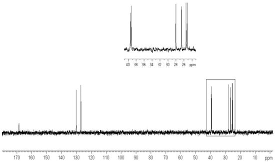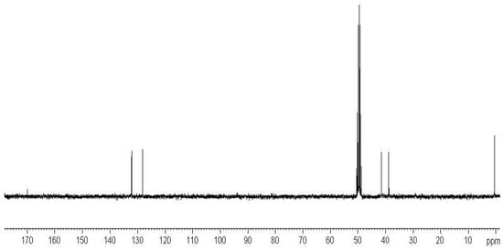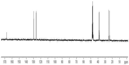 The 13C NMR spectra of 11a, 11b, and 11c presented five, seven, and nine signals, respectively. All showed the two methylene carbons bound to the nitrogen atoms at 38.85 and 41.48 ppm (11a), 37.92 and 38.56 ppm (11b), as well as at 39.22 and 39.45 ppm (11c). Similarly, all spectra showed two signals belonging to the vinyl systems at 128.13 and 132.16 ppm (11a), 126.21 and 129.60 ppm (11b) as well as at 126.99 and 130.11 ppm (11c) and the signal of the carbonyl group at 169.90 ppm (11a), 167.45 ppm (11b) and 168.49 ppm (11c) (Figure 5, Figure 6 and Figure 7). Also, the spectrum of 11b showed two additional signals due to the two methylene groups inside the aliphatic chain at 23.80, 25.13 (Figure 6), while the spectrum of 11c presented four additional signals at 25.19, 25.47, 26.61, 28.02, due to the four methylene groups inside the aliphatic chain (Figure 7).