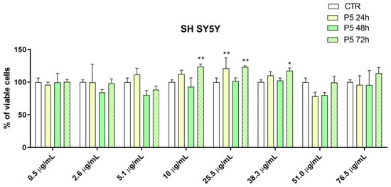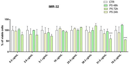 The human neuroblastoma cell lines IMR-32 and SH SY5Y were maintained in a complete medium (Dulbecco’s modified Eagle medium; Sigma, Milan, Italy) containing 10% v/v heat-inactivated fetal bovine serum (Gibco-Invitrogen S.r.l., Carlsbad, CA, USA) and 50 IU/mL penicillin G; 50 µg/mL streptomycin sulfate; and 2 mM L-glutamine (all reagents from Euroclone S.p.A., Milan, Italy). Cells were periodically tested for mycoplasma contamination (Mycoplasma Reagent Set, Aurogene s.p.a, Pavia, Italy). To assay cell proliferation, cells were seeded in triplicate in a 96 w plate at 3000 to 10,000 cells per well in 200 µL of complete medium. After 24 h, the medium was changed, and the cells were exposed for 24, 48, or 72 h to P5 at 0.1, 0.5, 1, 2, 5, 7.5, 10, and 15 µM. The effect on cell growth was evaluated by a fluorescence-based proliferation and cytotoxicity assay (CyQUANT® Direct Cell Proliferation Assay, Thermo Fisher Scientific, Life Technologies, Monza Brianza, Italy) according to the manufacturer’s instructions. Briefly, at the selected times, an equal volume of detection reagent was added to the cells in culture and incubated for 60 min at 37 °C. The fluorescence of the samples was measured using the monochromator-based M200 plate reader (Tecan, Männedorf, Switzerland) set at 480/535 nm.