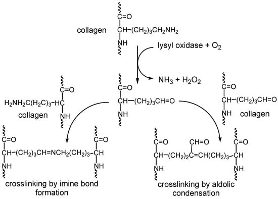 However, natural polymers such as protein-based materials composing the ECM, including collagen, its derivative gelatine, and elastin, as well as polysaccharides, including hyaluronic acid (HA), which are capable of forming 3D hydrogels, have attracted the attention of researchers as possible scaffolds for TE []. Natural polymers were used to fabricate biomaterials to assist tissues such as bone, bladder, cartilage, corneas, heart valves, nerves, pancreas, and skin []. Collagen has been used in the reconstruction of bladders [] as a substitute for skin [], nervous tissues [], and small intestine []. Anyway, collagen is an expensive material that can induce immunogenic responses. Otherwise, gelatine is a low-cost protein material that does not exist in nature and derives from collagen by denaturation of the triple helix structure into single chains upon acid or basic treatment followed by heating. Acid treatment provides type A gelatine, while basic treatment gives type B gelatine []. Gelatine can form hydrogels that have been used in the vascularization of engineered tissues without causing immunogenic responses. Additionally, due to its numerous properties, including biodegradability and biocompatibility, gelatine is used in various sectors. Specifically, in the biomedical field, gelatine has proven to be an excellent vehicle for the controlled release of bioactive molecules []. Unfortunately, scaffolds made only of collagen- or gelatine have been demonstrated to not possess adequate mechanical properties (modulus, strength), including stiffness and biodegradation rate, for in vitro handling and long-term cell culture [,]. In nature, collagen is stabilized and reinforced by reticulation through the lysyl oxidase (LO)-mediated oxidation of the ε-amino groups of its lysine and hydroxylysine moieties to aldehyde groups and subsequent aldolic condensations reactions or imine bonds formation between different chains according to Scheme 1.