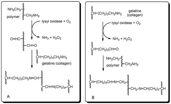 LO-mediated reticulation of gelatine in our project by imine bond formation. (A) Aldehyde groups deriving from the LO-mediated oxidation of NH2 groups of synthetic polymers could react with NH2 groups of gelatine to form imine bonds; (B) aldehyde groups deriving from the LO-mediated oxidation of NH2 groups of gelatine could react with NH2 groups of synthetic polymers to form imine bonds.