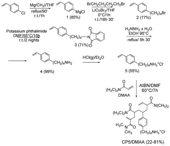Scheme 4 shows the previously reported synthetic procedure necessary to prepare monomer 5 and its copolymers [,]. In this work, CP5/DMAA copolymers were prepared with different concentrations of 5 according to data reported in Table S1 in Supplementary Materials.