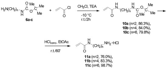 Since the monoacylation of α-ω-di-aminoalkanes is unfavorable [], to avoid the formation of bis-acrylamides, endowed with a strong tendency to polymerize and crosslinking, it was preferred to protect one of the two amine functions with the t-butoxy carbonyl group (Boc). Unfortunately, even upon this protection, small percentages of double acylation products formed. Anyway, since these side products were relatively stable and possessed a solubility very different from that of the products of monoacylation, they were easily separated from the desired Boc-protected compounds, which were effortlessly purified. Specifically, the monoprotected diamines 6a and 6b were synthesized according to Scheme 6.