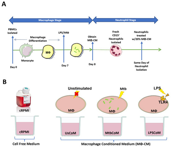 The host response to infections is complex, involving the release of various secreted factors from a wide variety of cells, including neutrophils, macrophages, monocytes, T cells, B cells, NK cells, and dendritic cells. Resident macrophages provide the first line of defence against invading pathogens in the lung, for example, where they recruit neutrophils and monocytes to the site of infection. The macrophage–neutrophils axis is undefined and relatively unexplored in the context of human lung infections to date. The current study set out to model the human macrophage–neutrophil axis in vitro (Figure 1A,B).