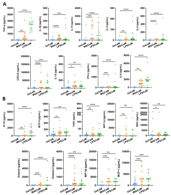 Characterizing secreted cytokine and chemokine levels in MΦ-CM (UsCoM, MtbCoM, and LPSCoM) from unstimulated, Mtb-stimulated, and LPS-stimulated hMDMs. hMDMs, differentiated from PBMCs isolated from healthy blood donors, were stimulated with iH37Rv Mtb for three hours and were washed to remove unphagocytosed Mtb. hMDMs were also left unstimulated and treated with LPS (100 ng/mL) in parallel. (A) 24 h post-stimulation, the secreted levels of the cytokines TNF-α, IL-1β, IL-10, IL-4, IL-2, CXCL8, IL-13, IFN-γ, and IL-6 were quantified using MSD Multi-Array technology, (B) along with the chemokines IP-10, MCP-4, TARC, MIP-1α, MDC, Eotaxin, Eotaxin-3, MIP-1β, and MCP-1. Bars denote mean ± SEM (n = 18 independent donors). * p < 0.05, ** p < 0.01, *** p < 0.001, and **** p < 0.0001, ns = no significance (Friedman ANOVA test with Dunn’s multiple comparisons tests).