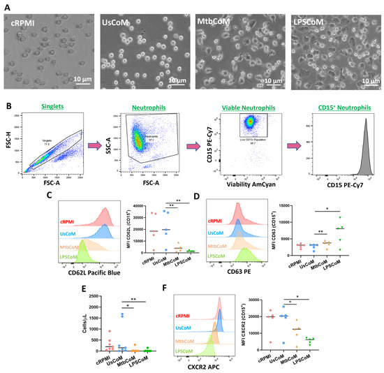 Having established in hMDMs that Mtb or LPS can induce the expression of various cytokines and chemokines, many with known effects on neutrophil biology, we examined if this MΦ-CM had the capacity to activate neutrophils. To undertake these and other experiments for the remainder of the study, we examined the effect of four MΦ-CM types on various parameters of neutrophil function; 20% RPMI (cRPMI), 20% MΦ-CM from unstimulated hMDMs (UsCoM), 20% MΦ-CM from Mtb-stimulated hMDMs (MtbCoM), and 20% MΦ-CM from LPS-stimulated hMDMs (LPSCoM) (the remaining 80% is RPMI supplemented with 1% FBS). The cRPMI treatment was also supplemented with 10% human serum to control for the 10% human serum in the UsCoM, MtbCoM, and LPSCoM treatments. The MΦ-CM was incubated with freshly isolated neutrophils one hour prior to experimental analysis. Upon exposing neutrophils for one hour to MΦ-CM, we observed that neutrophils exposed to MtbCoM or LPSCoM exhibited profound phenotypic differences in cell morphology compared to neutrophils exposed to cRPMI and UsCoM controls (Figure 3A). Neutrophils appeared more elongated and displayed some evidence of neutrophil extracellular traps (NETs), all surrogate indicators of activation (Figure 3A) [10]. To examine if MtbCoM or LPSCoM had the potential to activate neutrophils, we assessed the expression of the granulation and degranulation markers, CD62L and CD63, respectively, using flow cytometric analyses. Briefly, following doublet exclusion, neutrophils were selected based on size and granularity on a plot of forward scatter (FSC) versus side scatter (SSC) (Figure 3B). Subsequently, dead cells were excluded using a viability dye and neutrophils were defined as CD15+ cells (Figure 3B). We found that MtbCoM or LPSCoM treatment significantly reduced CD62L expression (Figure 3C) while simultaneously promoting the expression of CD63 (Figure 3D) in neutrophils, thereby confirming that MtbCoM or LPSCoM can activate neutrophils. Using cell culture transwell assay inserts, we found that MtbCoM- and LPSCoM-treated neutrophils exhibited a significantly reduced capacity to migrate toward fMLP compared to neutrophils treated with UsCoM (Figure 3E). Further flow cytometric analysis showed that this reduced capacity to migrate could be due to the downregulation of the CXCR2 receptor, a key mediator of migration in neutrophils (Figure 3F) [11].