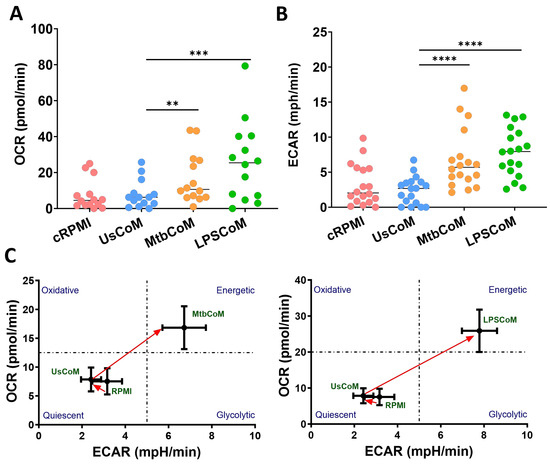 We have shown that MtbCoM or LPSCoM can augment metabolism in unstimulated neutrophils. However, metabolic rewiring can also occur upon activation and infection in neutrophils, to adapt to the invading pathogen and produce enough energy to fulfil its host-defensive duties [14]. Accordingly, we examined if MtbCoM- or LPSCoM-treated neutrophils exhibited altered immunometabolic profiles upon stimulation and activation (Figure 5). To do this, we stimulated neutrophils with Mtb, to mimic Mtb infection in the human lung (Figure 5A). Prior to assessing if MtbCoM or LPSCoM affects the ECAR and OCR profiles, we first established a baseline and examined if Mtb stimulation alone affected neutrophil metabolism. We found that soon after Mtb stimulation, Mtb significantly increased both the ECAR and OCR profiles in neutrophils (Figure 5B), indicative of an increase in OXPHOS and glycolysis in these cells. Interestingly, we found no significant effect on OCR and ECAR in neutrophils pre-treated with cRPMI, UsCoM, MtbCoM or LPSCoM upon Mtb stimulation (Figure 5C), indicating that Mtb stimulation alone augmented and potentially maxed out the immunometabolic response in these cells, regardless of MΦ-CM pre-treatment.