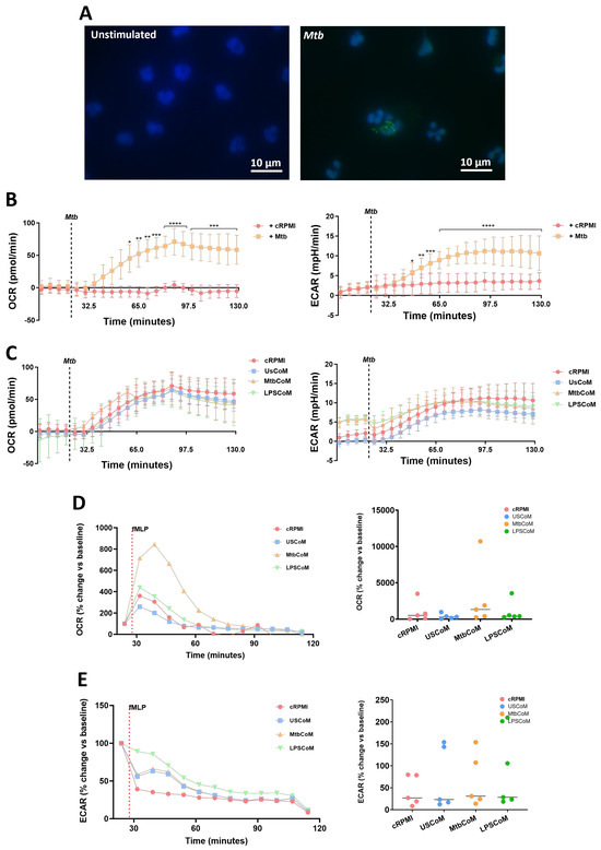 Assessing if MΦ-CM from Mtb-stimulated or LPS-stimulated hMDMs affects bioenergetics in fMPL-stimulated and Mtb-stimulated human neutrophils. (A) Neutrophils were seeded into Labtek II chamber slides, unstimulated or stimulated with iH37Rv-Mtb, washed, and phagocytosed Mtb was fluorescently visualised through auramine (FITC) and hoechst (DAPI) staining. (B) Baseline metabolic OCR (left) and ECAR (right) values were examined in neutrophils in response to iH37Rv-Mtb (MOI: 1–10), (C) prior to determining if 20% cRPMI, UsCoM, MtbCoM, and LPSCoM pre-treatment exhibited an effect on OCR and ECAR profiles in neutrophils stimulated with iH37Rv (n = 3). After neutrophils were treated for one hour with 20% cRPMI, UsCoM, MtbCoM, and LPSCoM, cells were also stimulated with fMLP (1.25 ng/mL) and real-time baseline (D) OCR and (E) ECAR values were determined utilising Seahorse extracellular flux assays (n = 5). (D,E) OCR and ECAR rates were plotted and graphed (right-hand side graphs) at the time point reflecting the highest metabolic response to fMLP stimulation (40 min). * p < 0.05, ** p < 0.01, *** p < 0.001, and **** p < 0.0001 ((A,B): Friedman ANOVA test with Dunn’s multiple comparisons tests; (D,E): Two-way RM ANOVA with Šídák’s multiple comparisons test).