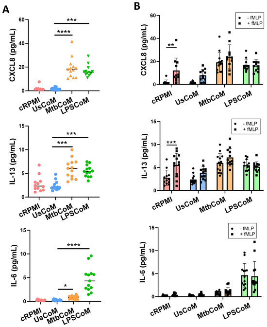 Elucidating if MΦ-CM from Mtb-stimulated or LPS-stimulated hMDMs alters cytokine release in primary human neutrophils. Human neutrophils were treated with 20% cRPMI, UsCoM, MtbCoM, and LPSCoM for 1 h. Following incubation, neutrophils were left unstimulated (A) and stimulated with 1.25 ng/mL fMLP (B). 4 h later, the secreted levels of CXCL8, IL-13, and IL-6 were assessed using MSD-ELISA (n = 13). * p < 0.05, ** p < 0.01, *** p < 0.001, and **** p < 0.0001 ((A): Friedman ANOVA test with Dunn’s multiple comparisons tests; (B): Two-way ANOVA with mixed effects model multiple comparisons test).