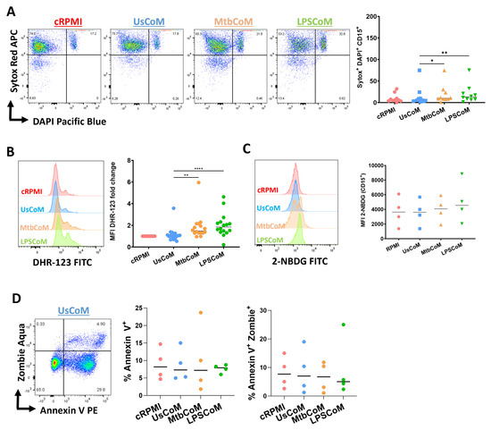 To explore the effect of MtbCoM or LPSCoM on neutrophil effector functions further, flow cytometric analyses were carried out to examine if MΦ-CM-treated neutrophils exhibited alterations in various cellular parameters including NETosis, ROS production, glucose uptake and apoptotic activity (Figure 7). We found that MtbCoM- or LPSCoM-treated cells exhibited significantly higher levels of NETosis, confirmed by cells testing double positive for the dyes Sytox red and DAPI (Figure 7A). Furthermore, we showed that MtbCoM or LPSCoM promoted ROS production in these neutrophils, indicated by significantly increased median fluorescence intensity (MFI) for DHR-123 (Figure 7B). Neutrophils treated with cRPMI, UsCoM, MtbCoM and LPSCoM exhibited comparable levels of glucose uptake (Figure 7C). Finally, as cell death can indirectly and directly contribute to some of the findings presented here (activation status, metabolism ROS production, for example), we also examined if the MΦ-CM could alter early and late apoptosis but found no significant changes across all treatment groups (Figure 7D). All raw data used in this manuscript can be accessed in the Supplementary File.