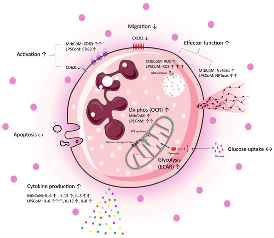 A graphical summary of the study. Freshly isolated CD15+ neutrophils were exposed to four different conditions, complete RPMI media (cRPMI), media from unconditioned MDMs (UsCoM), media from MDMs infected with Mtb (MtbCoM), and media from MDMs stimulated with LPS (LPSCoM). Glucose uptake and apoptosis were unaffected by MtbCoM and LPSCoM. Effects on several aspects of neutrophil function were examined via several methods, including flow cytometry, Agilent Seahorse assays, MSD ELISA, and transwell migration assays. Our data suggests an augmentation of many neutrophil functions as a result of MtbCoM and LPSCoM, such as NETosis, ROS generation, and inflammatory cytokine production. Neutrophils exposed to the inflammatory conditioned media also exhibited a significant energetic shift, with glycolysis and oxidative phosphorylation significantly augmented. MtbCoM and LPSCoM also decrease neutrophil chemotaxis, as shown both via the quantification of the chemotactic receptor CXCR2 and via transwell migration assays. Overall, our data demonstrated the importance of the macrophage–neutrophil axis in infection.
