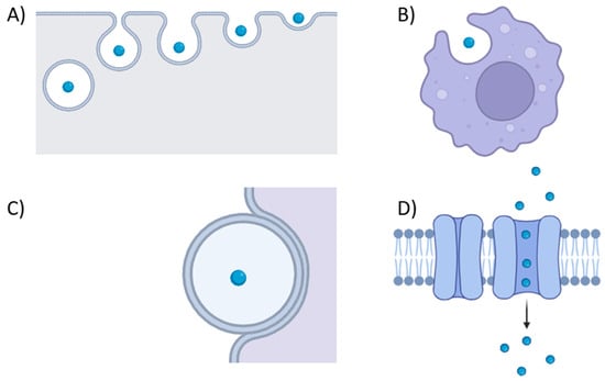 The different mechanisms of entry into host cells of membrane vesicles. EVs are represented as dark gray circles. Endocytosis (A), phagocytosis (B), fusion with membrane (C), and internalization mediated by receptor (D) (this figure was created by the authors using Biorender.com, app.biorender.com (accessed on 26 February 2024)).