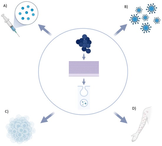 Gram-positive bacterial MVs and clinical applications: novel vaccination approaches (A), viral infections blocking (B), anti-tumor effects and cancer therapy (C), and dermatological diseases (D) (this figure was created by the authors using Biorender.com, app.biorender.com (accessed on 26 February 2024)).