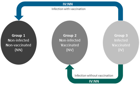 Study design and presentation of the group comparisons. To isolate infection-specific effects, we compared group 3 (infected and vaccinated, IV) with group 2 (vaccinated but not infected, NV). Additionally, we assessed the effects of vaccination in the context of infection by comparing group 3 with group 1 (neither infected nor vaccinated, NN).