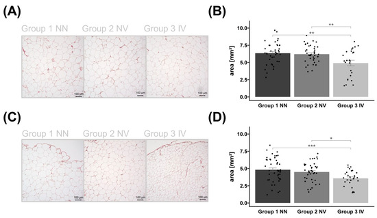 Histological examination of the adipocytes. Representative examples of HE-stained subcutaneous (SAT) (A) and visceral adipose tissue (VAT) (C) images of control group 1, non-infected and non-vaccinated (NN); group 2, vaccinated but non-infected (NV); as well as group 3, infected and vaccinated (IV). The corresponding bar plots of adipocyte areas are presented as mean ± SEM with individual measurements as dots (B/D). The same applies to VAT in (C,D). Images are in 10× magnification, captured using Keyence BZ-X800 microscope (KEYENCE DEUTSCHLAND GmbH, Neu-Isenburg, Germany), and measured by Keyence BZ-X800 Analyzer (KEYENCE DEUTSCHLAND GmbH, Neu-Isenburg, Germany). Significant p-values are shown as * p < 0.05, ** p < 0.01, and *** p < 0.001.