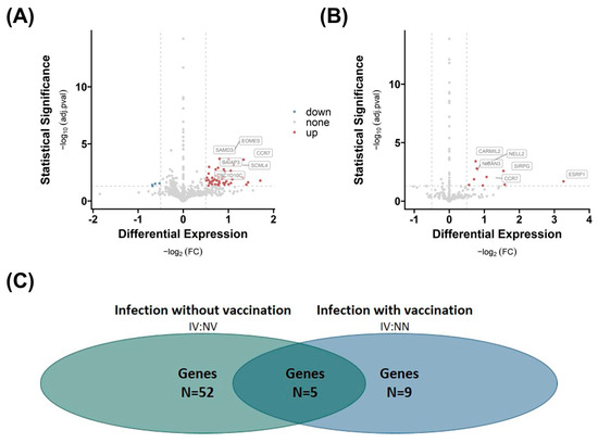 The analysis reveals that infection has an impact on the number of differentially expressed genes in SAT. The number of differentially regulated genes is significantly higher when vaccination is excluded (n = 52), as shown by the comparison of group 3 IV with group 2 NV (Figure 3A). When comparing group 3 IV with group 1 NN, indicating the impact of vaccination, we detected a lower number of differentially regulated genes (n = 9), indicating a positive effect of vaccination on gene expression profile (Figure 3B; see Supplementary Materials, Table S1).