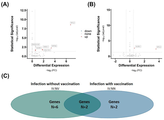 In VAT, we observe a similar trend: when comparing group 3 NN with group 2 NV (Figure 4A), the analysis reveals a lower number (n = 2) of differentially regulated genes than in comparison with group 1 NN (n = 6, Figure 4B). Both the gene killer cell lectin-like receptor subfamily D, member 1 (KLDR1), and myosin light chain 2 (MYL2) are significantly different expressed in both comparisons. However, the fold change and significance p-value are higher when comparing group 3 IV with group 2 NV, indicating an enhanced influence of infection on the number of regulated genes in VAT, which might be suppressed by vaccination.