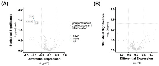 The selected frozen plasma samples were aliquoted and sent to Olink® Proteomics AB for proteomic analysis using the proximity extension assay technology for three different panels. The Olink® Inflammation, Cardiometabolic, and Cardiovascular II Panels were utilized to measure the levels of 276 proteins (Supplementary Table S2). The resulting data were provided as Normalized Protein Expression (NPX) values. Differential Expression (DE) analysis was conducted using the R package OlinkAnalyze v. 3.5.1 provided by Olink (Olink Proteomics AB, Uppsala, Sweden).
