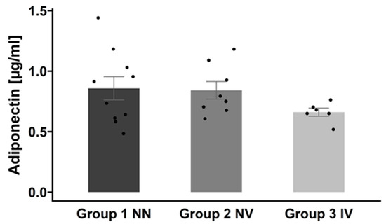 Adiponectin serum concentrations across the three groups. Adiponectin levels are presented as mean ± SEM. Group 1 NN: non-infected and non-vaccinated; group 2 NV: non-infected and vaccinated; group 3 IV: infected and vaccinated.