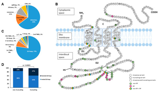 Variant distribution in the PRPH2 Spanish cohort. (A) Distribution of alleles by type of variant, considering 103 probands. (B) Location of disease-causing coding variants in the protein structure and associated phenotypes. (C) Distribution of proband alleles by protein domain location. (D) Distribution of non-truncating and truncating alleles found in probands inside and outside the D2-loop domain (p-value = 0.0003). CNV: copy number variant; C: cytoplasmatic loop; D1: intradiscal loop D1 (D1-loop); D2: intradiscal loop D2 (D2-loop); RP: retinitis pigmentosa.