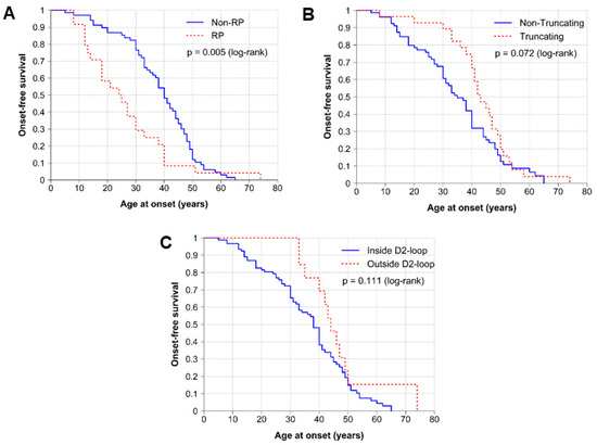 Genotype–phenotype correlations. Long-rank test and survival curve (onset-free) of the AAO of the first symptom of retinopathy, considering (A) the phenotypic presentation between retinitis pigmentosa (RP) and non-RP (MD and CR/CRD) subgroups; (B) the type of variant, truncating (frameshift, nonsense and splicing) versus non-truncating (missense, in-frame) variants; (C) the location of coding variants in the D2-loop domains: outside D2-loop versus inside D2-loop.